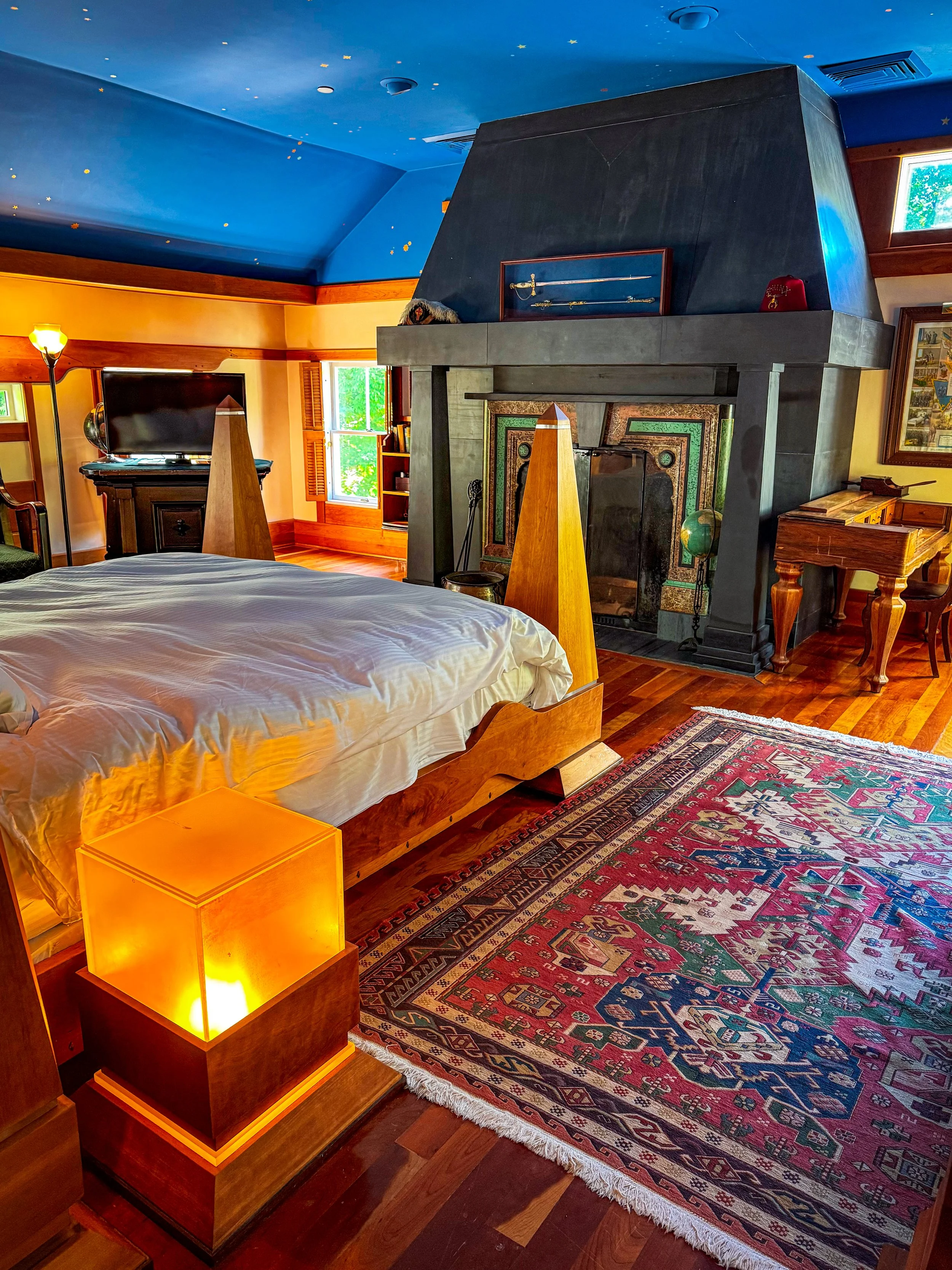 In the center of the room is a beautifully designed king size wooden bed complete with two antique eagles positioned on the bed posts. The fireplace mantle was incredible and made of solid slate slabs. The starry night painted ceiling and incredible lighting in the room completed the experience.